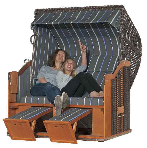 Halbliegemodell2-Sitzer XLgeschwungene OstseeformMassivholzkonstruktion ringsrum handgeflochtenmehrfach verstellbarer Oberkorbimprägnierter Markisenstoff, Stoff 17 extra starke Polsterung